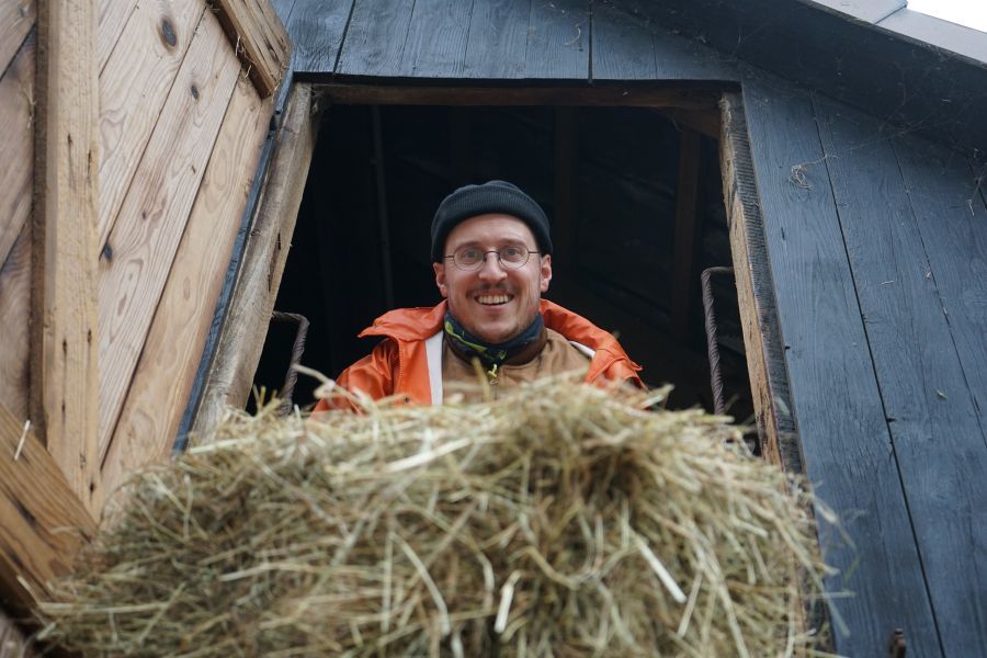 Seit sechs Wochen ist der 33-jährige Betriebshelfer auf dem Hof im Einsatz – und mittlerweile nicht mehr wegzudenken. Er fräst die Einstreu für die Putenställe, wäscht die Tränken aus, repariert den Futtermischer und füttert die Pferde. Neben einer Biogasanlage gehören auch 25 Pferde zum Hof. Alex’ Arbeitstag beginnt um acht Uhr.