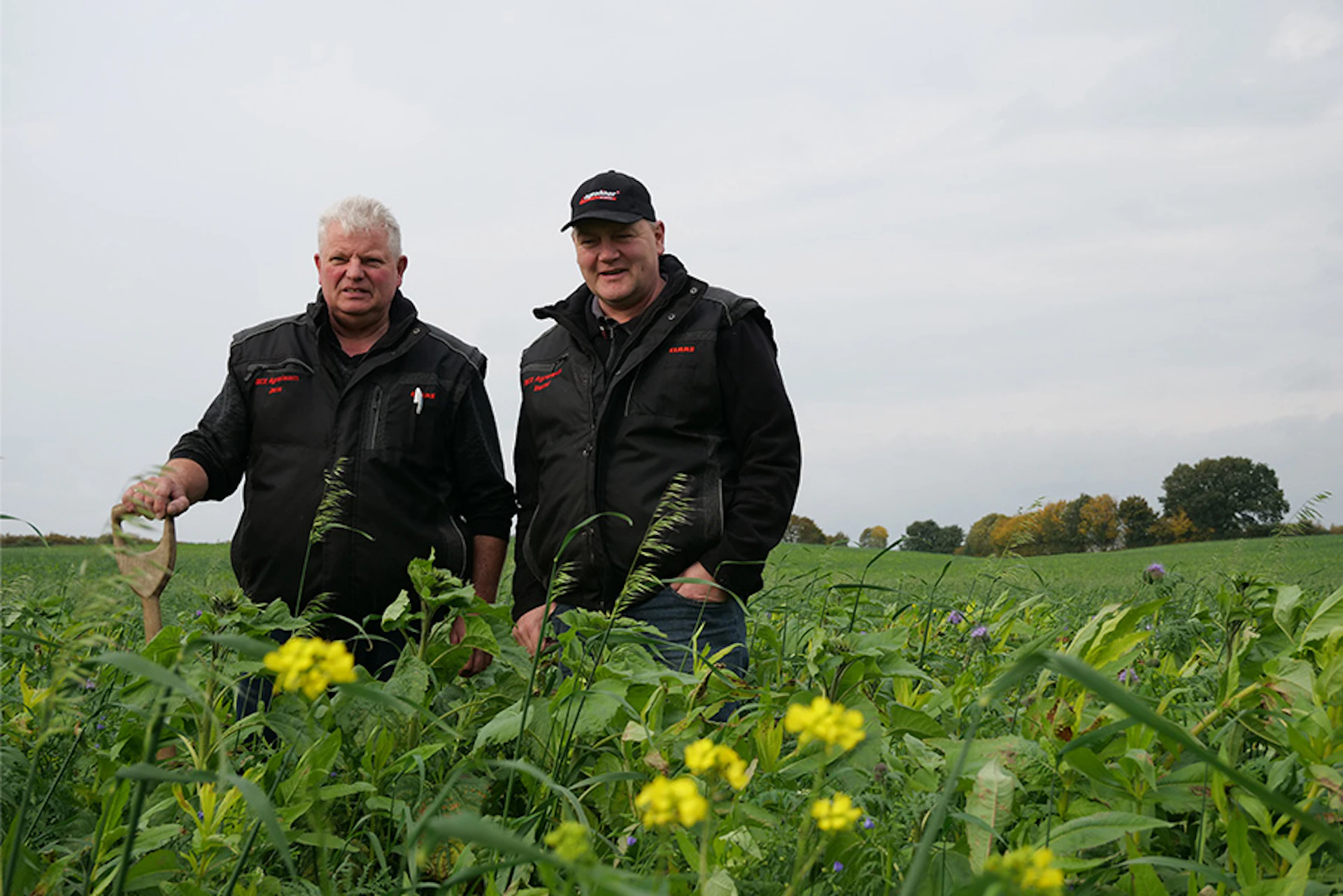 Zwischenfrüchte sind als „Futter“ für das Bodenleben auf allen Flächen Standard. Gesät wird eine bewährte Mischung aus Gräsern, Klee, Öllein, Sorghum und weiteren Gemengepartnern. Auch Untersaaten haben die experimentierfreudigen Landwirte bei einigen Kulturen etabliert, sogar bei Raps und Ackerbohnen. „Das klappt nicht immer, wie etwa beim Winterweizen im letzten Jahr. Niederschlag und Temperatur haben großen Einfluss auf den Erfolg. Aber wir lernen immer mehr dazu und probieren es dann wieder mit anderen Ansätzen“, sagt Bernd Boekhoff.