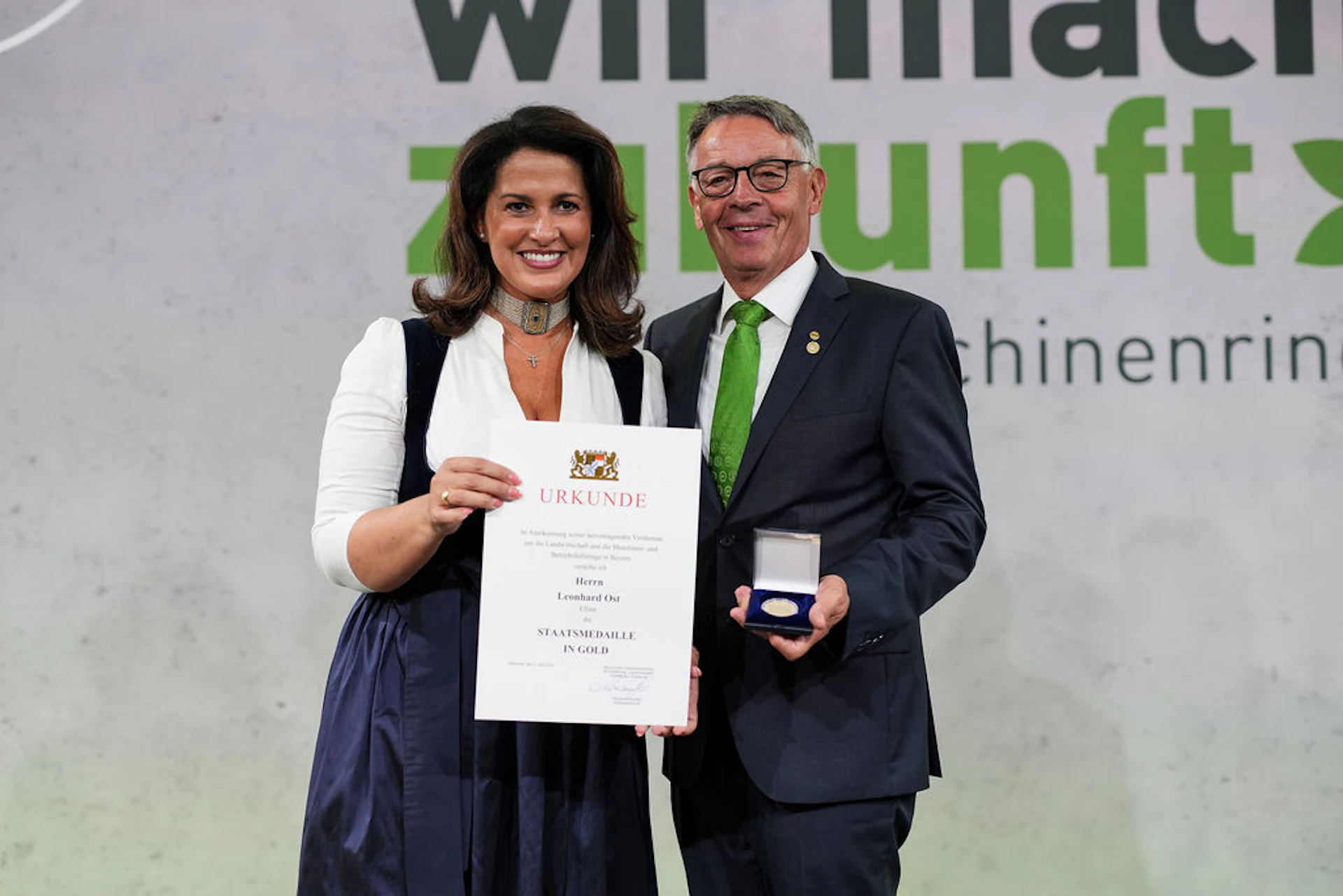 Ehre für Leonhard Ost: Beim Tag der Maschinenringe überreichte Bayerns Staatsministerin für Ernährung, Landwirtschaft und Forsten, Michaela Kaniber, dem scheidenden Präsidenten des Bundesverbandes der Maschinenringe, Leonhard Ost die Bayerische Staatsmedaille in Gold für seine Verdienste. Der 70-jährige Landwirt und Unternehmer aus Ellzee im Landkreis Günzburg übergab beim Tag der Maschinenringe in Neuburg an der Donau seine Spitzenpositionen als Präsident des Bundesverbandes der Maschinenringe und als Vorsitzender des Kuratoriums Bayerischer Maschinenringe (KBM) in die Hände seiner Nachfolger.