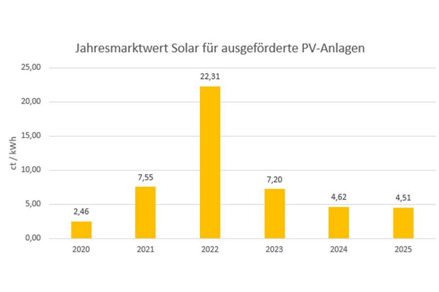 Der Jahresmarktwert Solar beschreibt den mengengewichteten durchschnittlichen Börsenpreis, zu dem Solarstrom im vergangenen Jahr an der Strombörse gehandelt wurde. Er ist damit auch ein zentraler Referenzwert für die Vergütung von Strom aus ausgeförderten PV‑Anlagen bis 100 kW Leistung. Für das Jahr 2025 liegt dieser Marktwert bei 4,508 ct/kWh. Betreiber solcher Anlagen erhalten diesen Wert abzüglich der Vermarktungskosten, die vom jeweiligen Netzbetreiber einbehalten werden. Grundlage hierfür ist die offizielle Marktwertübersicht.