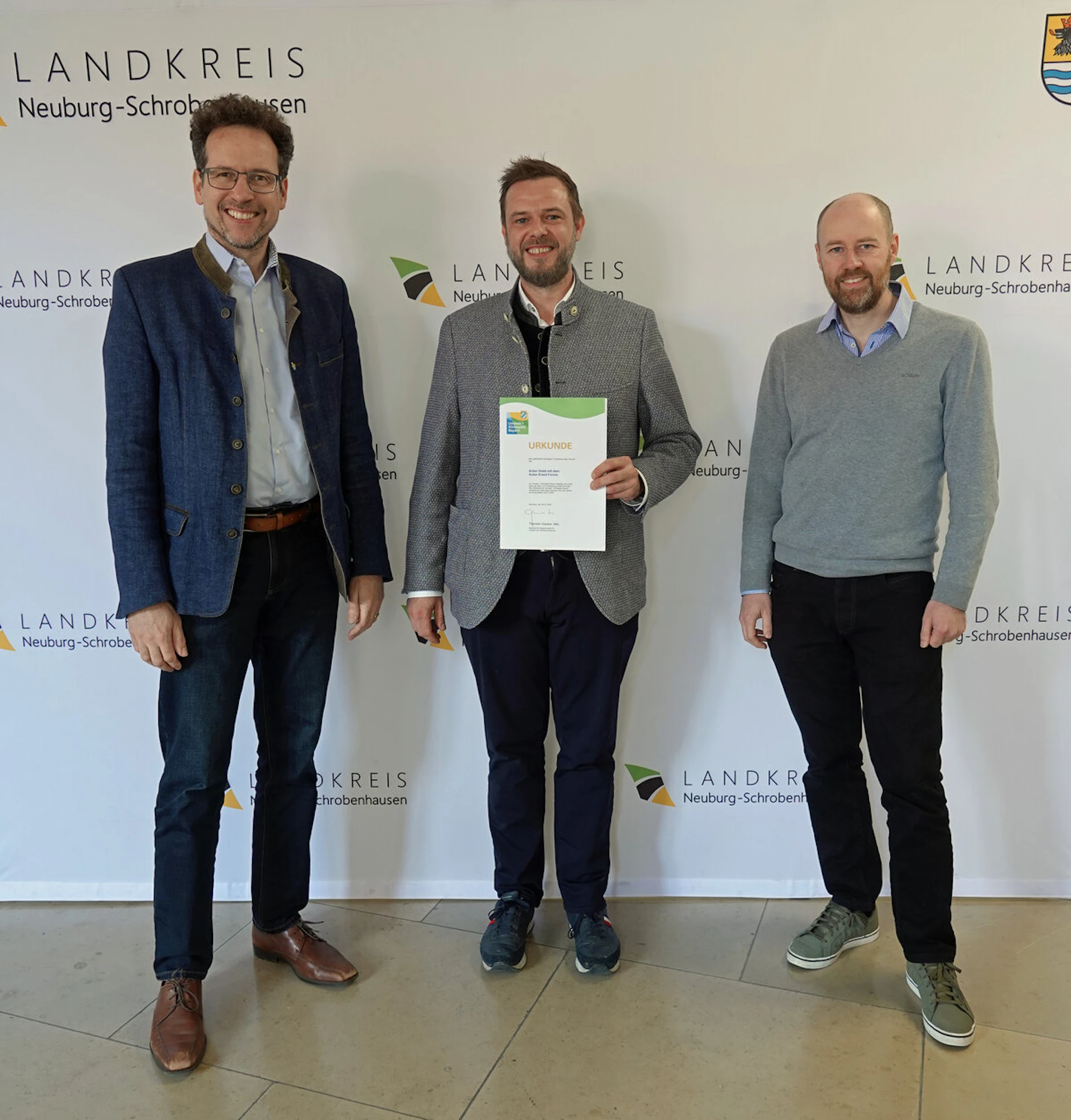 Im Namen des Bayerischen Umweltministers Thorsten Glauber hat Landrat Peter von der Grün die Teilnehmerurkunde am Umwelt- und Klimapakt Bayern an DAS ACKER Hotel der Maschinenringe Deutschland GmbH in Neuburg überreicht. Das im Jahr 2018 gegründete Hotel beschäftigt derzeit 50 Mitarbeitende und bietet 58 Zimmer für Übernachtungsgäste. Besonderen Wert legt das Haus auf den verantwortungsvollen Einsatz regionaler Produkte, eine bedarfsgerechte Warenbeschaffung sowie die weitgehende Vermeidung von Verpackungsmaterialien. Der Umwelt- und Klimapakt Bayern ist eine Vereinbarung zwischen der Bayerischen Staatsregierung und der bayerischen Wirtschaft. Er beruht auf Freiwilligkeit, Eigenverantwortung und Kooperation. Ziel ist es, den betrieblichen Umweltschutz kontinuierlich weiterzuentwickeln und nachhaltige Maßnahmen langfristig im Unternehmensalltag zu verankern.