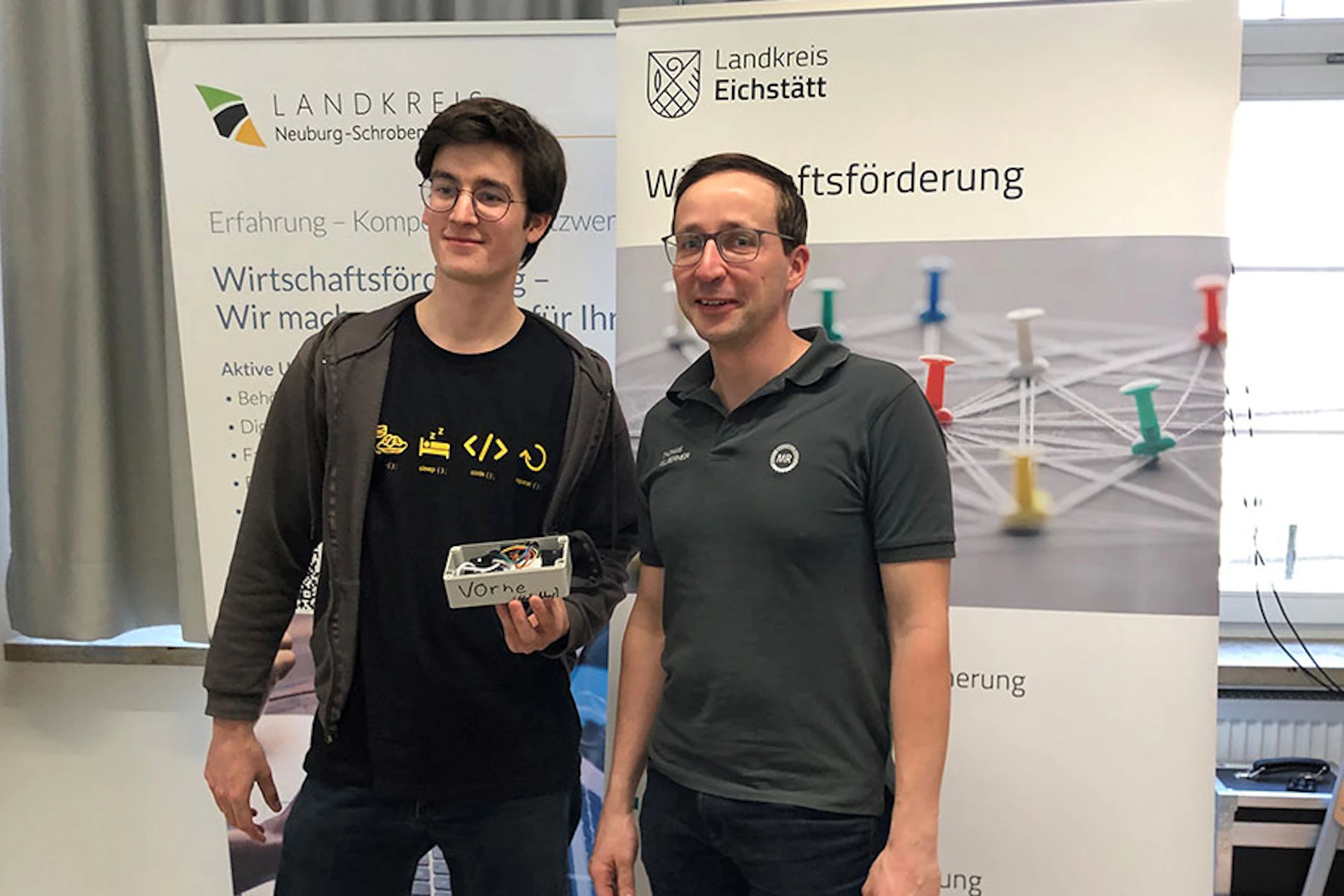 Thomas Felbermeir (rechts) und Quirin Sailer präsentierten den preisgekrönten Prototyen des Agrar-Navis. Foto: Andrea Haslauer