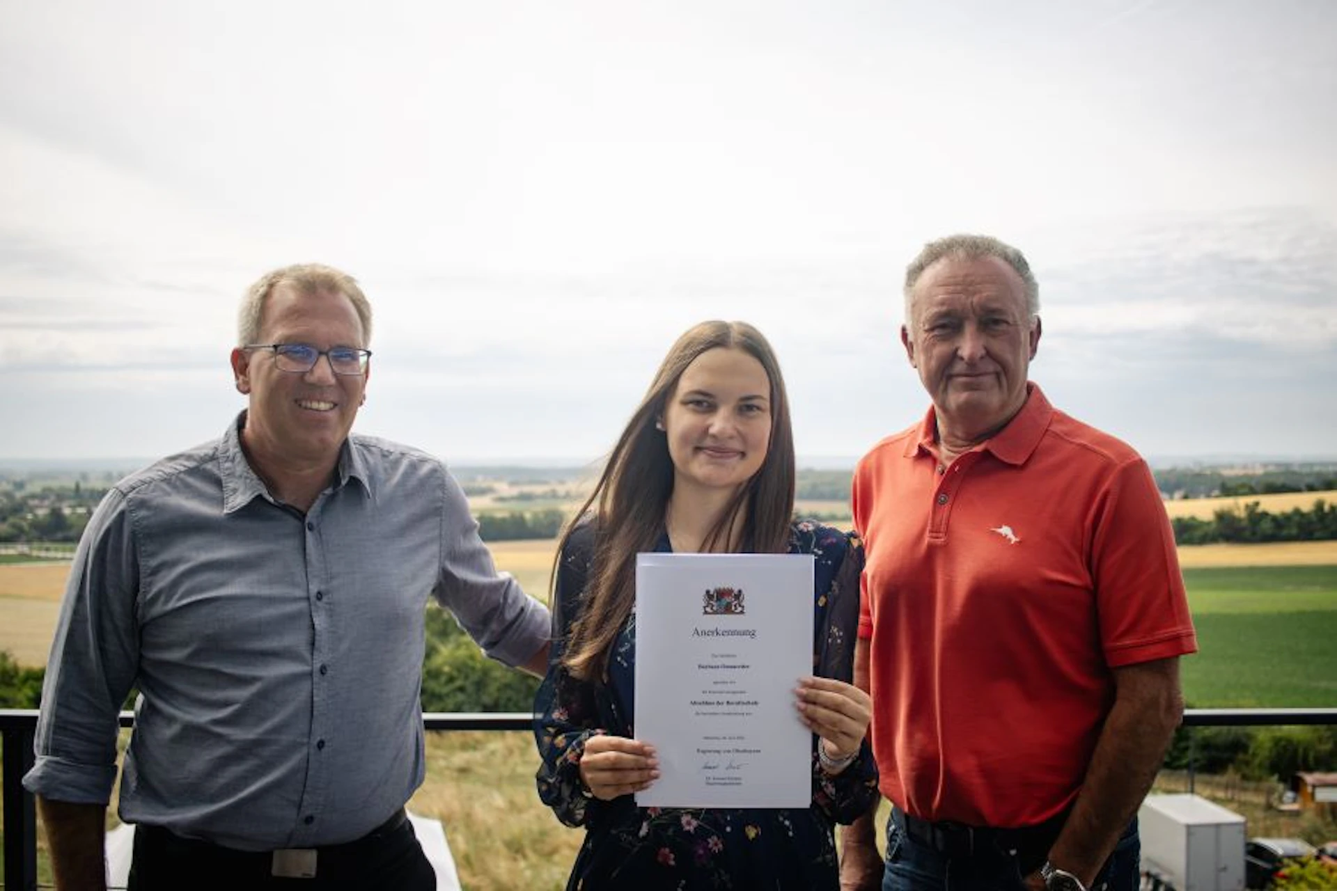 Maschinenringe Geschäftsführer Erwin Ballis (rechts) und Ausbilder Thomas Mayr gratulie-ren Barbara Omasreiter zu ihrem hervorragenden Abschneiden. Foto: Fischer/BMR