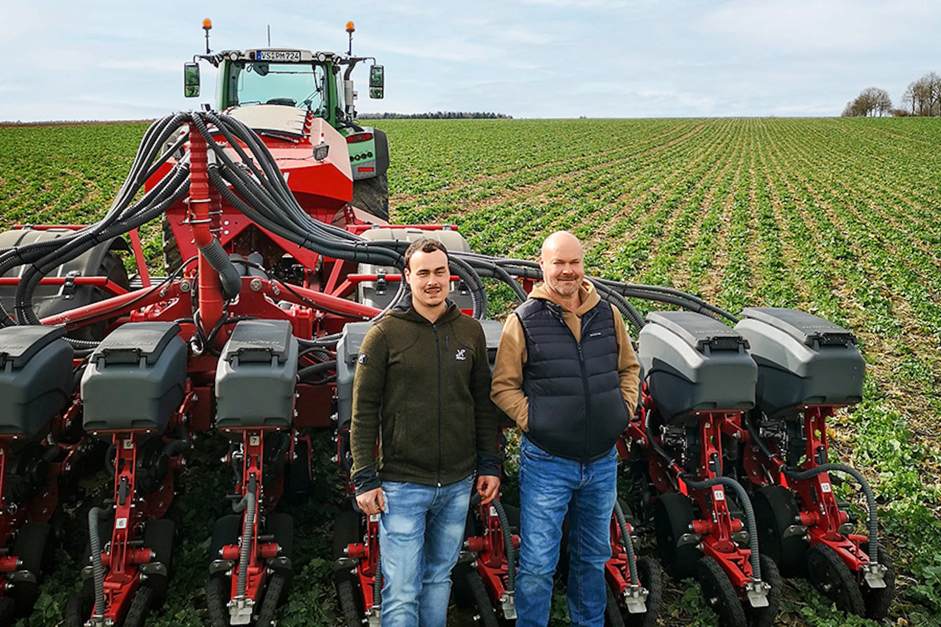Patrick und Georg Moog haben den Rapsanbau auf ihrem Betrieb im südlichen Baden-Württemberg auf Einzelkorn-Aussaat umgestellt. Die überzeugten Maschinenring-Landwirte säen mit der 2022 angeschafften zwölfreihigen Technik auch überbetrieblich aus.