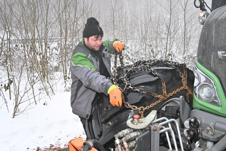 Es ist bald 13 Uhr als Andreas die schweren Schneeketten von den Vorderreifen seines Fendt zieht. Foto: Gunther Lehmann