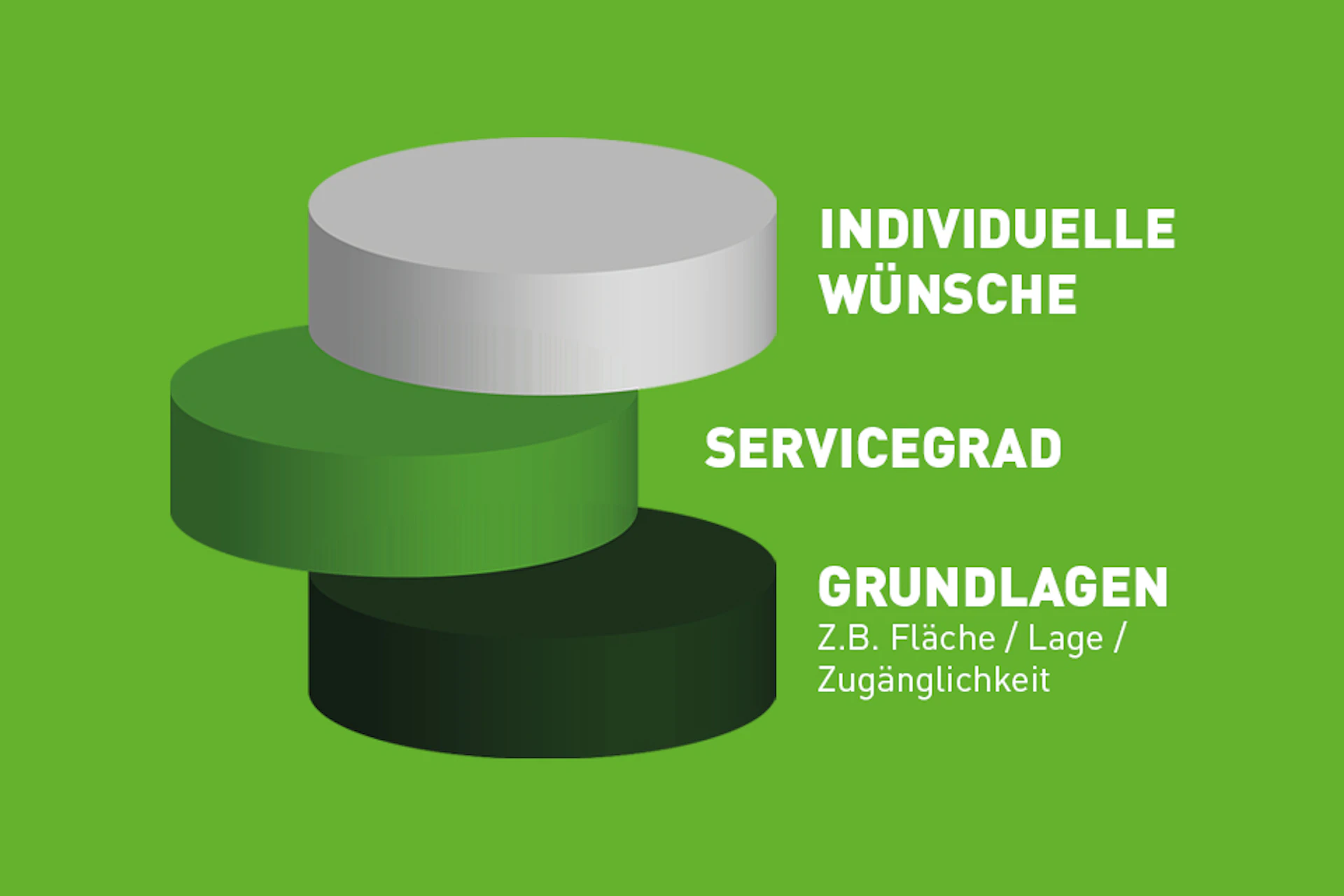 Die Grafik zeigt ein dreistufiges Modell: Die Grundlagen (z. B. Fläche, Lage, Zugänglichkeit) bilden die Basis. Darauf baut der Servicegrad auf, der den Leistungsumfang bestimmt. An der Spitze stehen die individuellen Wünsche, die maßgeschneiderte Anpassungen ermöglichen.